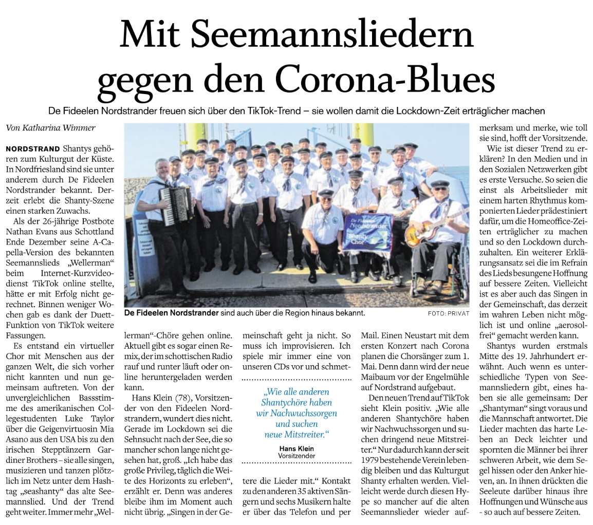 Hans Klein (78), Vorsitzender von den „Fideelen Nordstrandern“, wundert dies nicht. Gerade im Lockdown sei die Sehnsucht nach der See, die so mancher schon lange nicht gesehen hat, groß. „Ich habe das große Privileg, täglich die Weite des Horizonts zu erleben“, erzählt er. Denn was anderes bleibe ihm im Moment auch nicht übrig. „Singen in der Gemeinschaft geht ja nicht. So muss ich improvisieren. Ich spiele mir immer eine von unseren CDs vor und schmettere die Lieder mit.“ Kontakt zu den anderen 35 aktiven Sängern und sechs Musikern halte er über das Telefon und per Mail. Einen Neustart mit dem ersten Konzert nach Corona planen die Chorsänger zum 1. Mai. Denn dann wird der neue Maibaum vor der Engelmühle auf Nordstrand aufgebaut. „Wie alle anderen Shantychöre haben wir Nachwuchssorgen und suchen dringend neue Mitstreiter.“